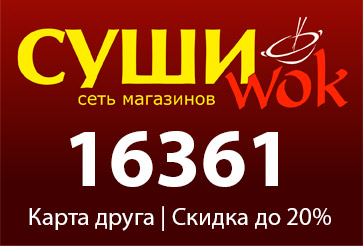 Суши Wok — международная сеть магазинов общественного питания формата take-away, что означает — горячие блюда на вынос. Можно кушать в магазине за столиками или же упаковать с собой. В ассортименте вы найдете блюда китайской или японской кухни, а также ингредиенты и посуду для их приготовления.
